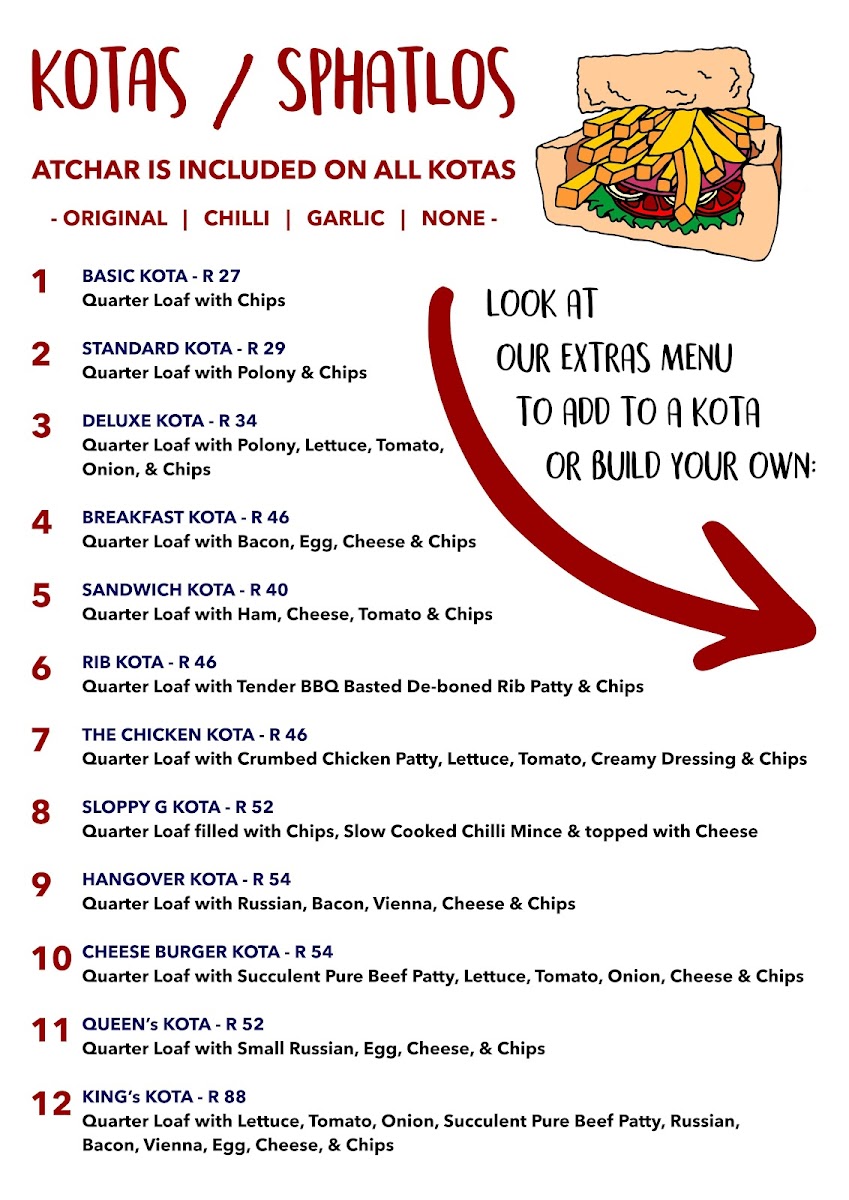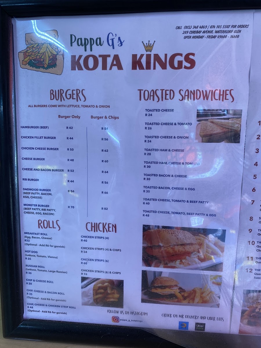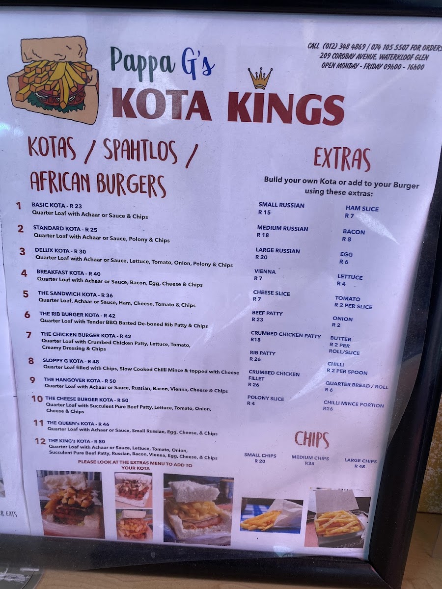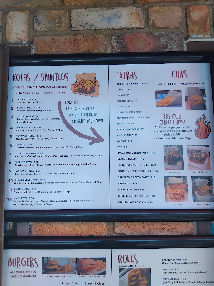 Welcome to Pappa G's Kota Kings, a culinary gem nestled in Waterkloof Glen, Pretoria! Experience the essence of South African cuisine with a menu that primarily showcases their renowned kota. This hearty, filled bread dish is a must-try, made fresh on-site, offering a delightful combination of flavors and textures that promise a satisfying meal. Customers rave about the fresh, delicious offerings that deliver both quality and affordability, ensuring that you leave with a full stomach without breaking the bank.